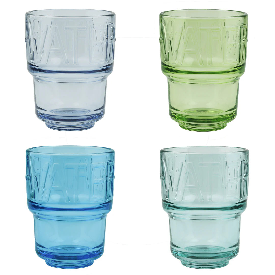 The Water Tumblers add a playful touch of French style to everyday refreshment. Embossed with the word WATER and crafted in luminous glass, they brighten the table with vibrant shades inspired by spring.